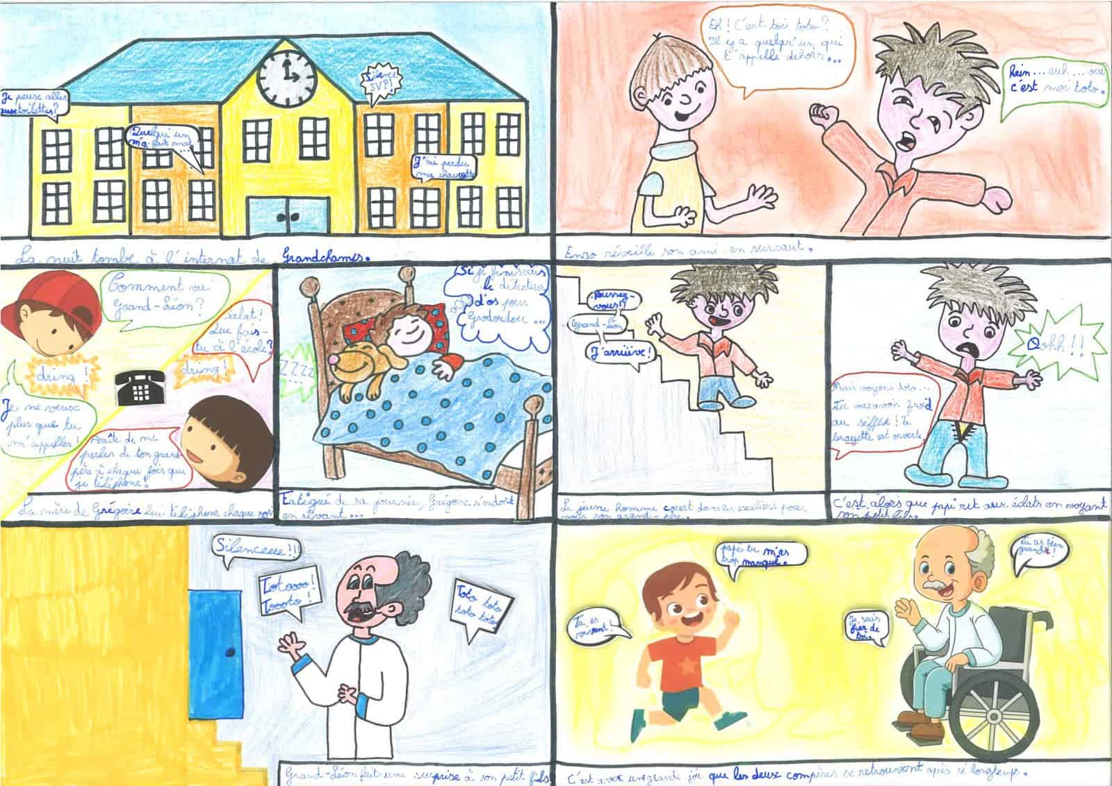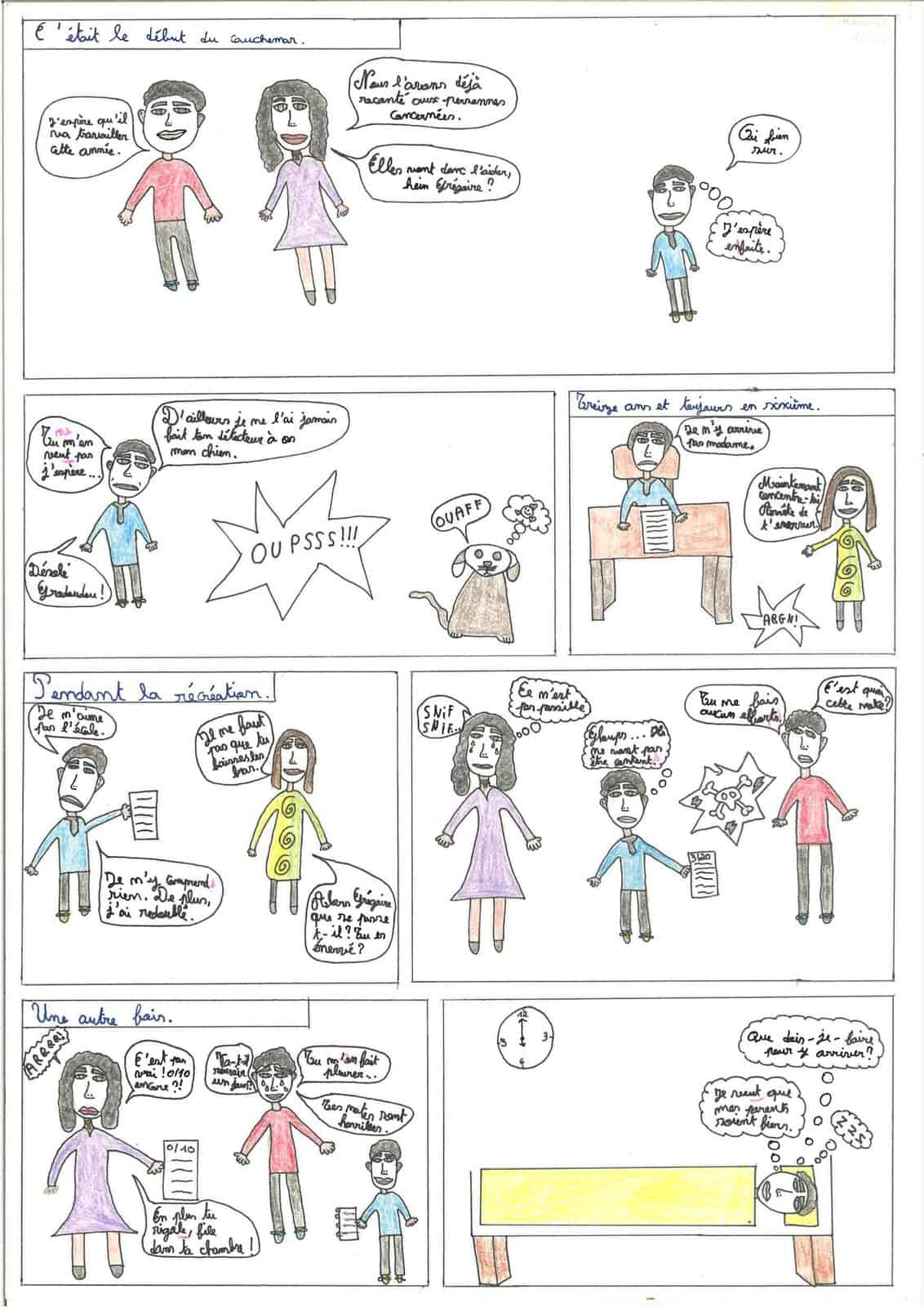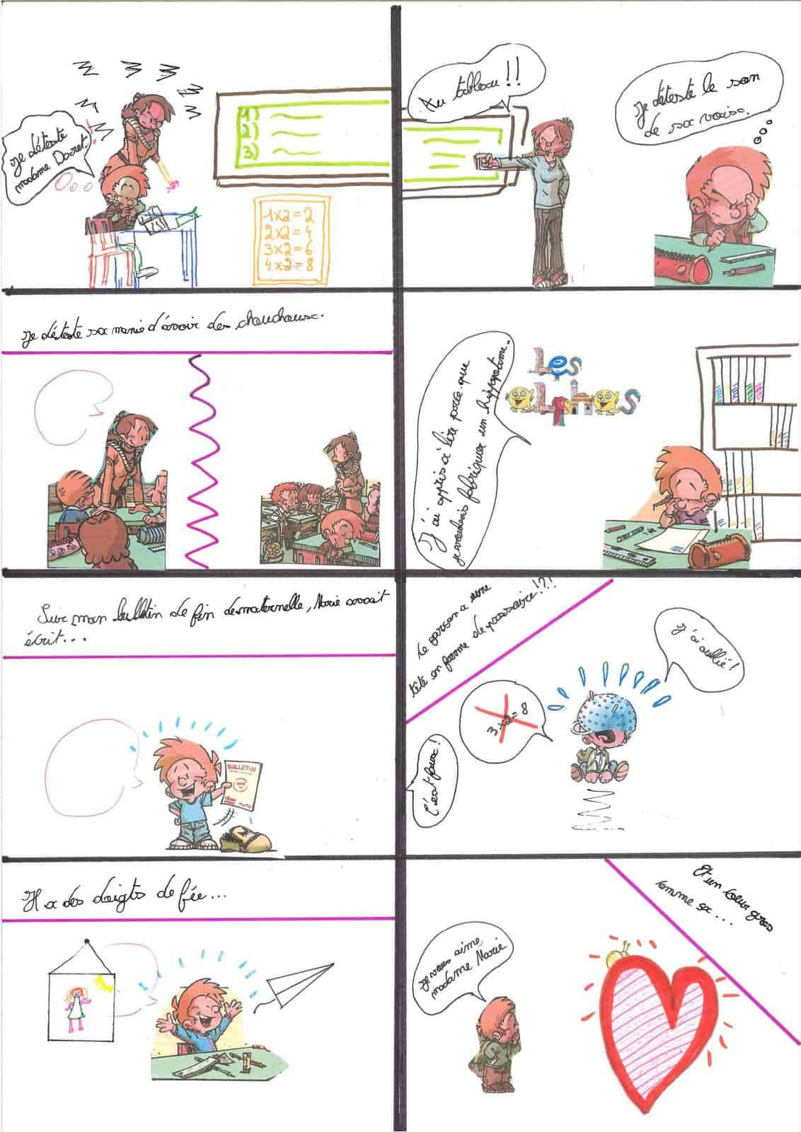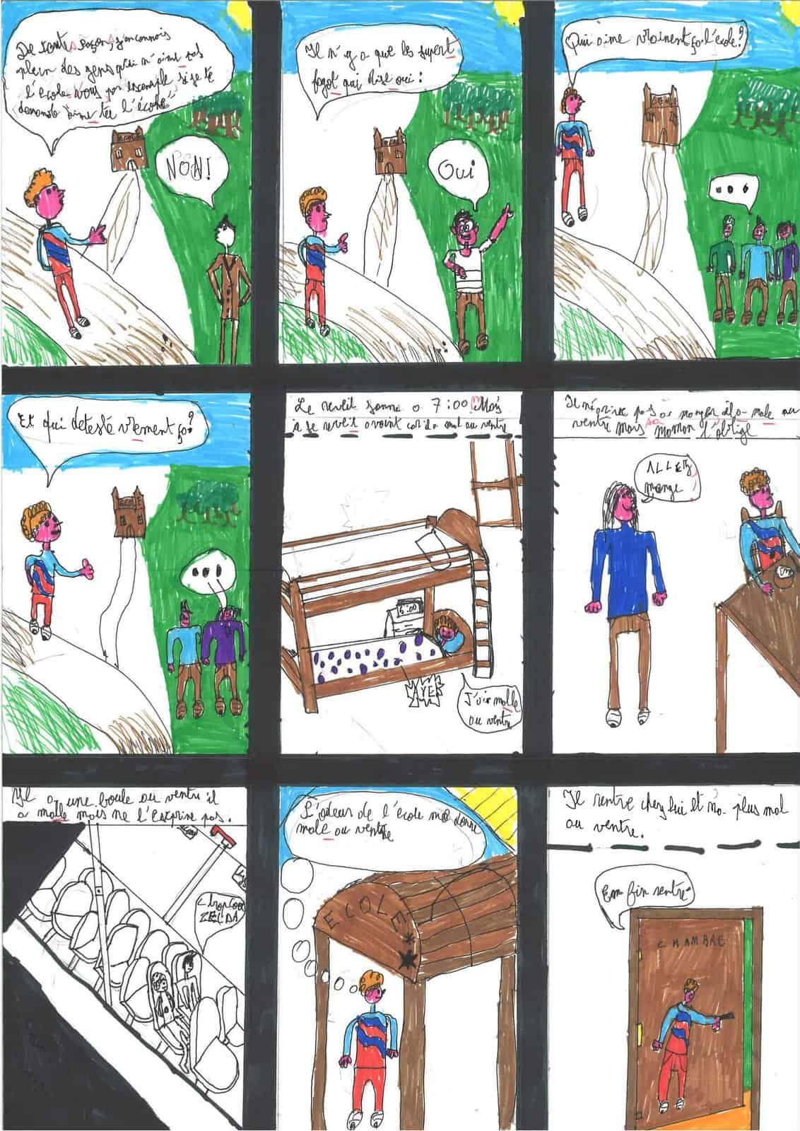 Le travail demandé consistait en la réalisation d’une planche de bande dessinée représentant un épisode apprécié par chaque élève.