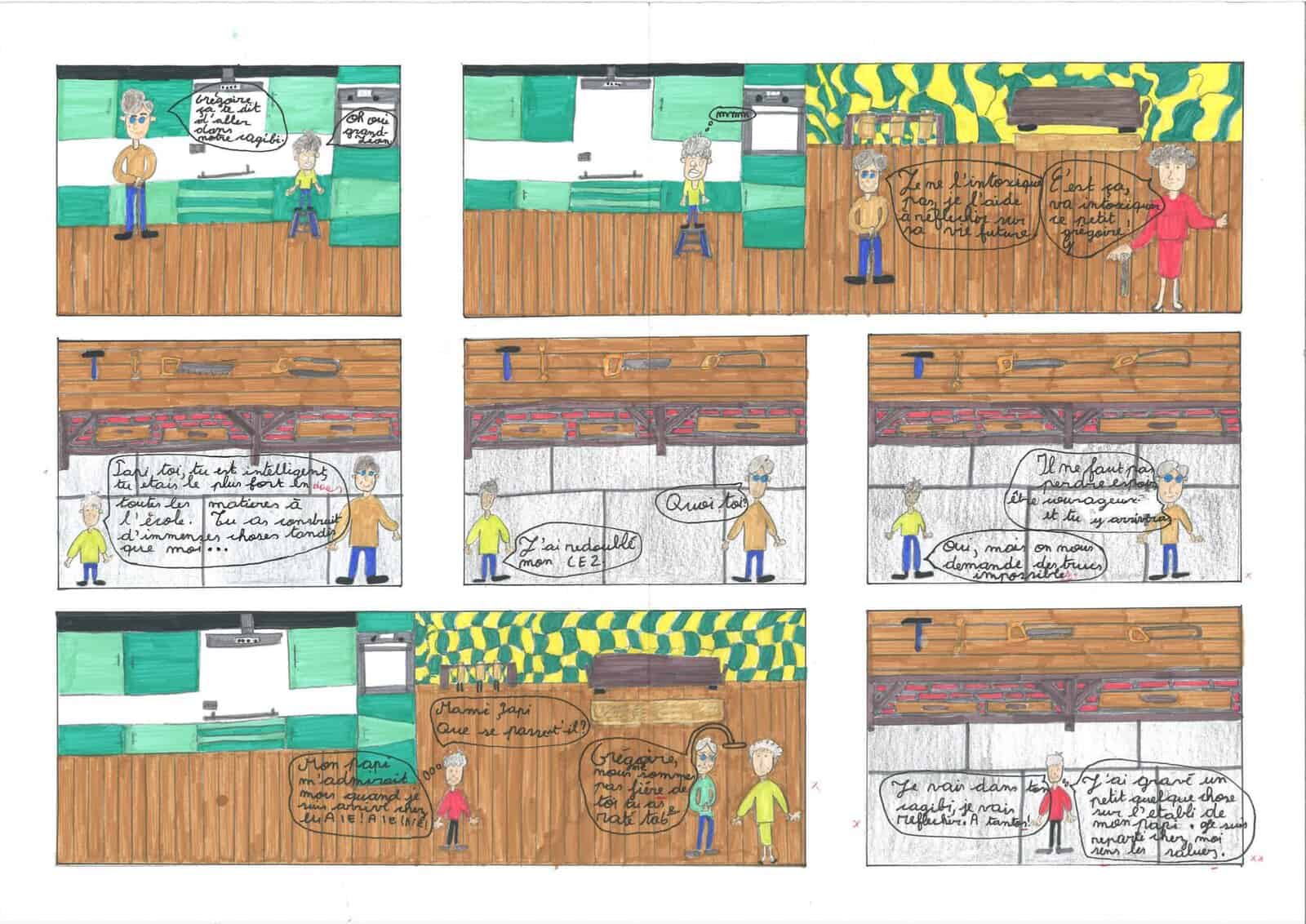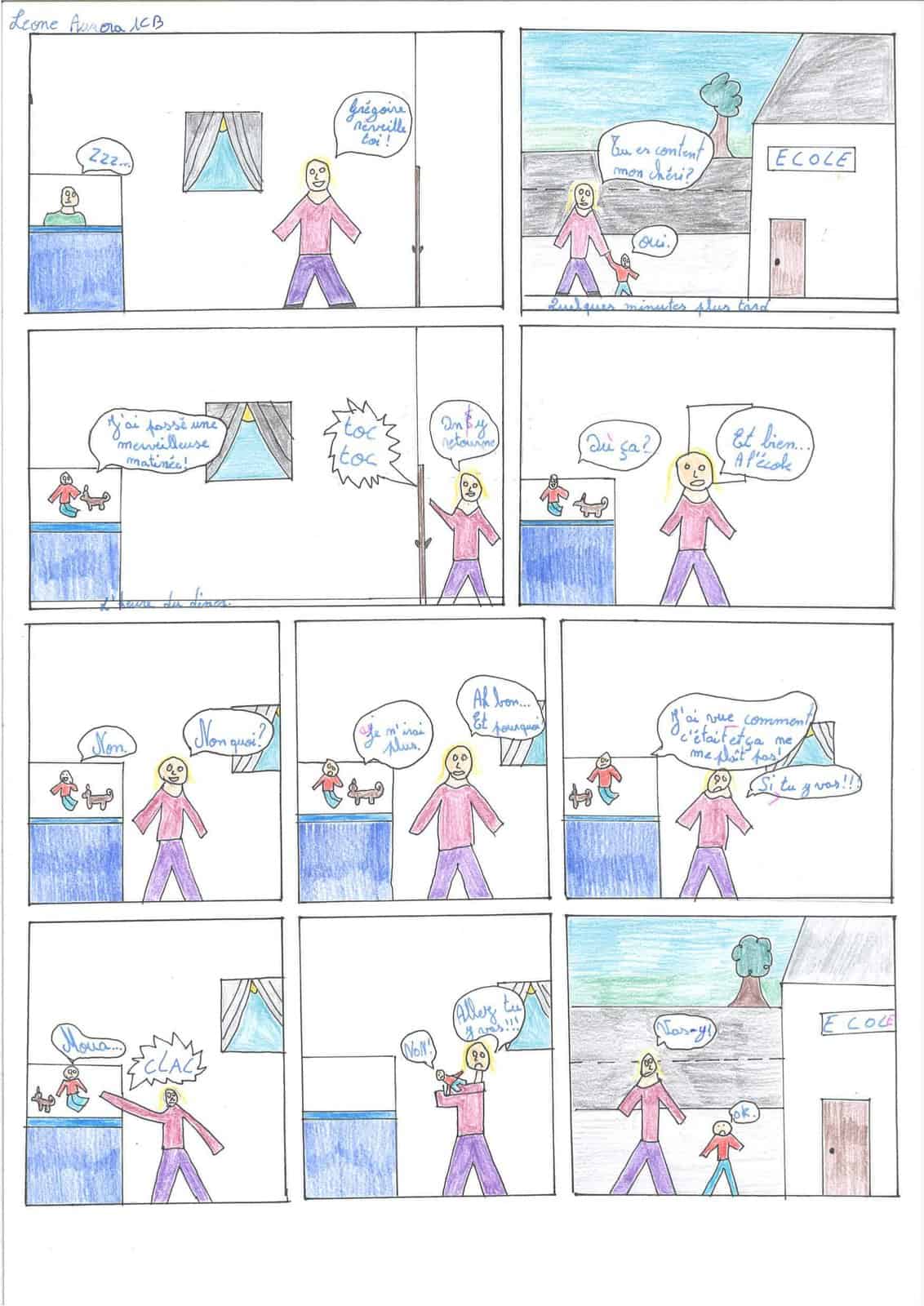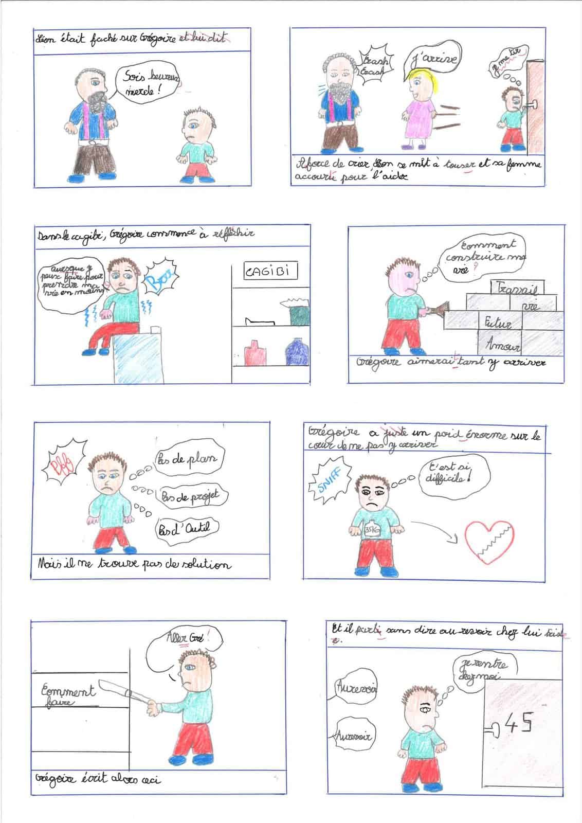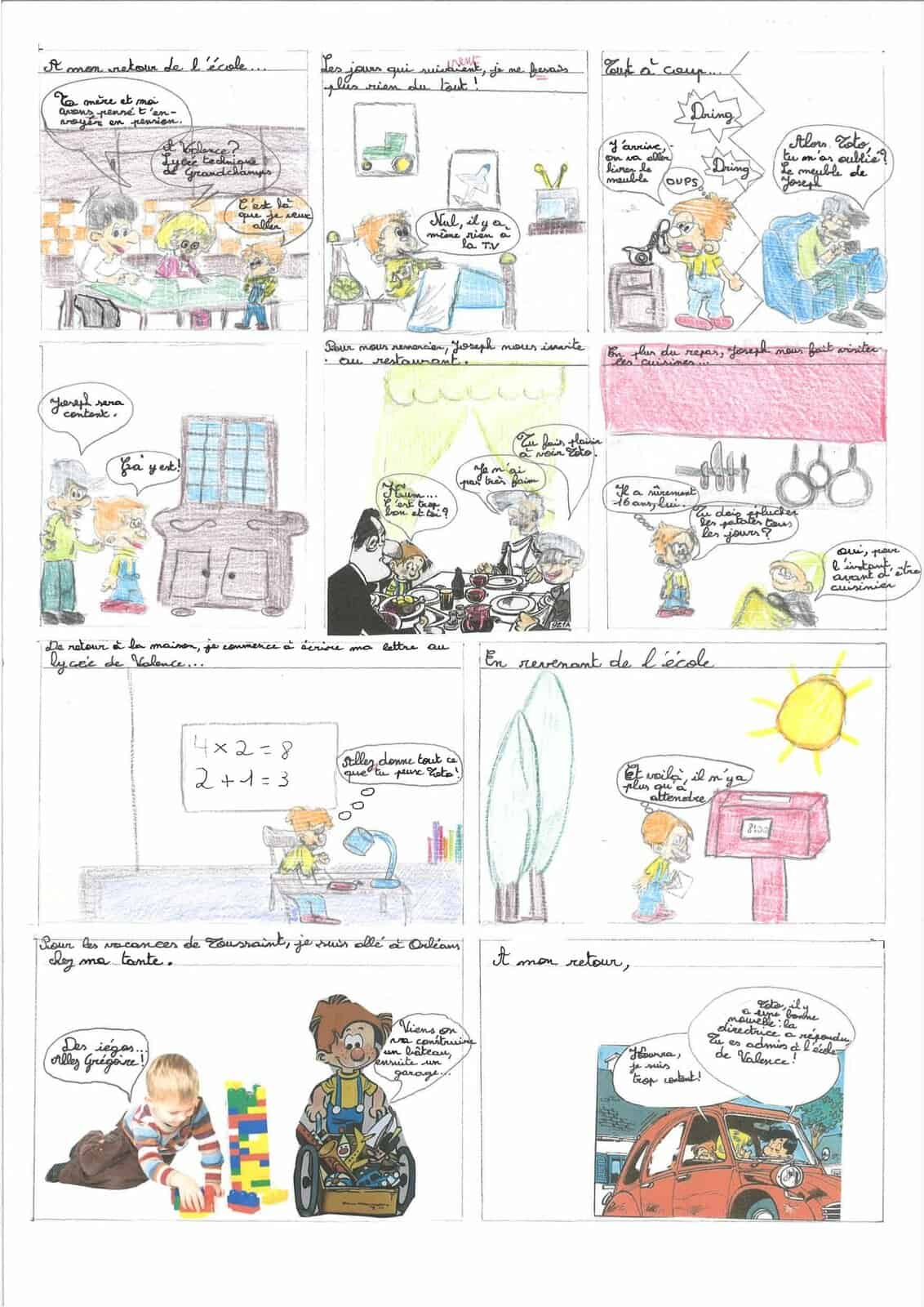 Le travail demandé consistait en la réalisation d’une planche de bande dessinée représentant un épisode apprécié par chaque élève.