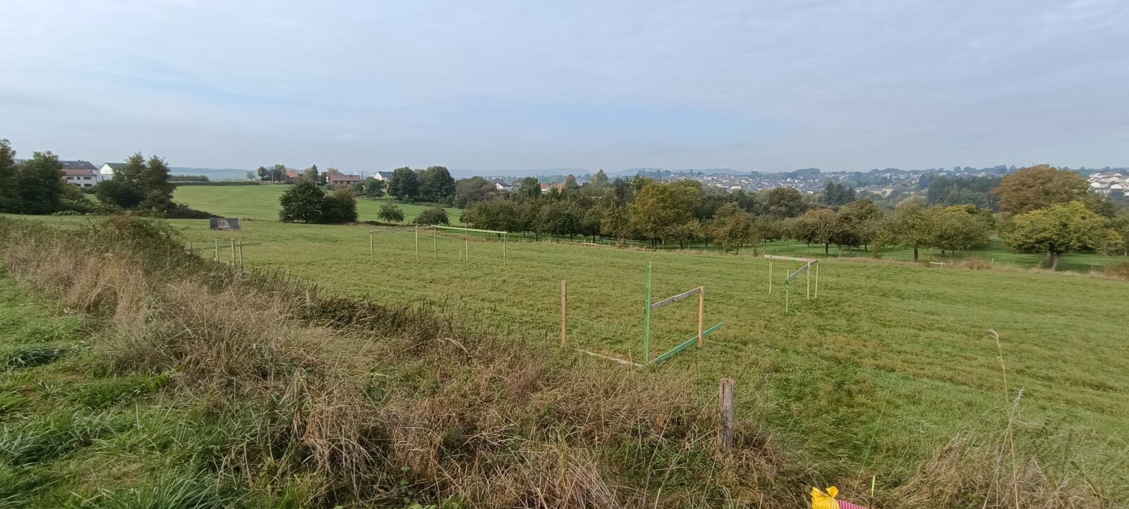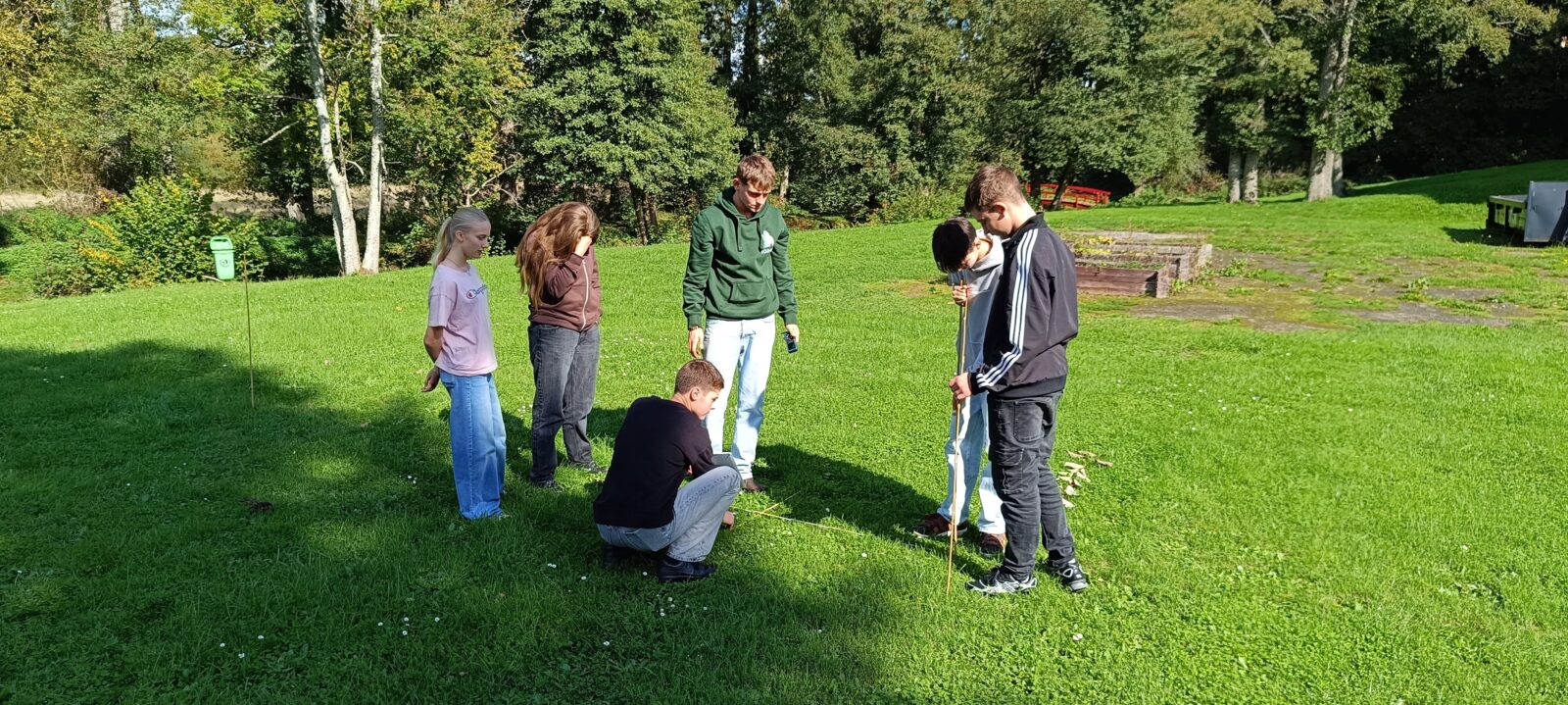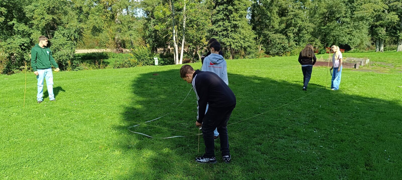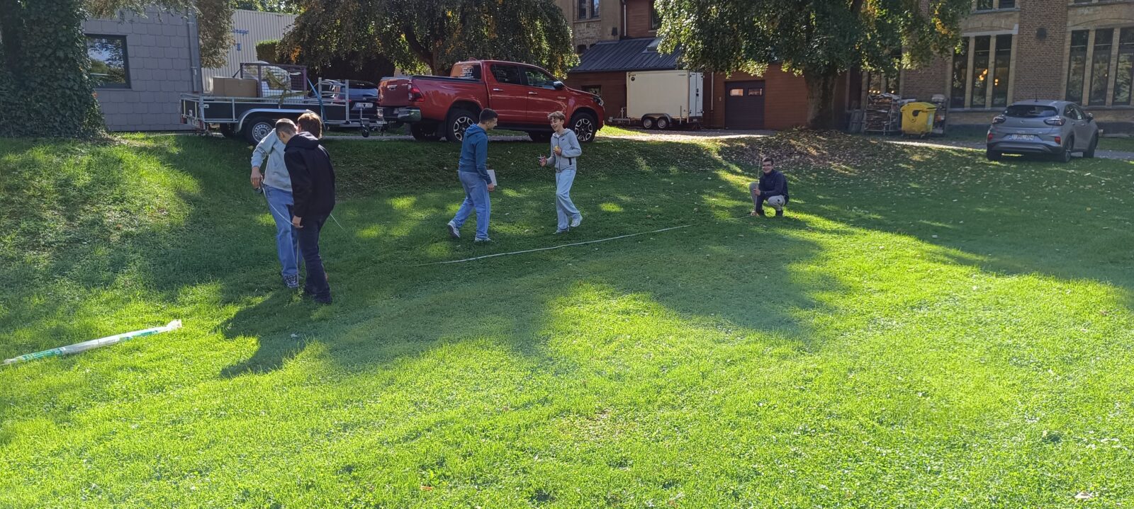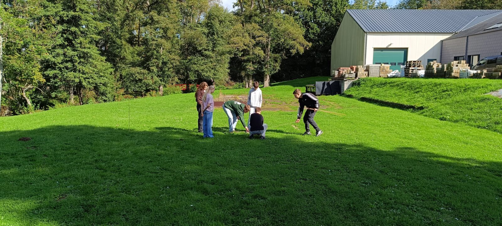 L’après-midi, tout le monde a profité d’une belle météo pour s’exercer aux constructions géométriques à l’aide d’outils de base (une corde, des piquets, un décamètre). Le défi du jour était de réaliser une construction parfaitement « d’équerre » et d’effectuer les vérifications nécessaires avec ces seuls outils à disposition, le tout avec une précision rigoureuse.