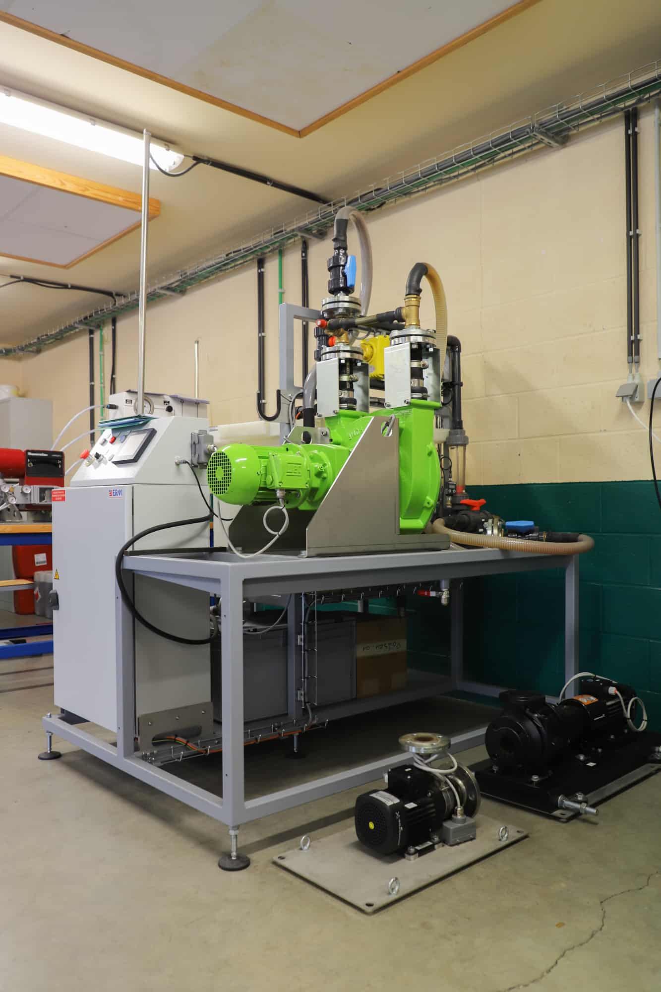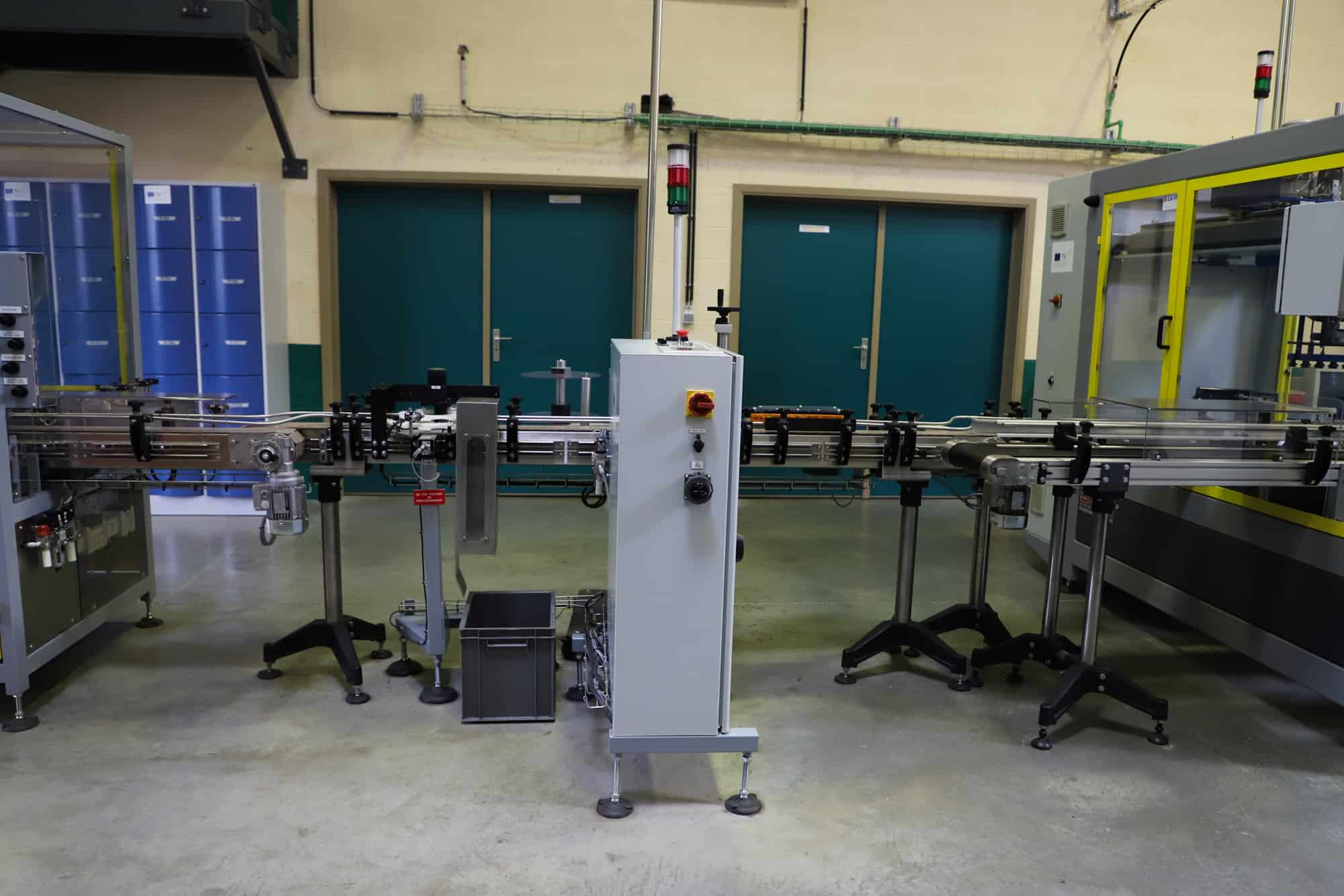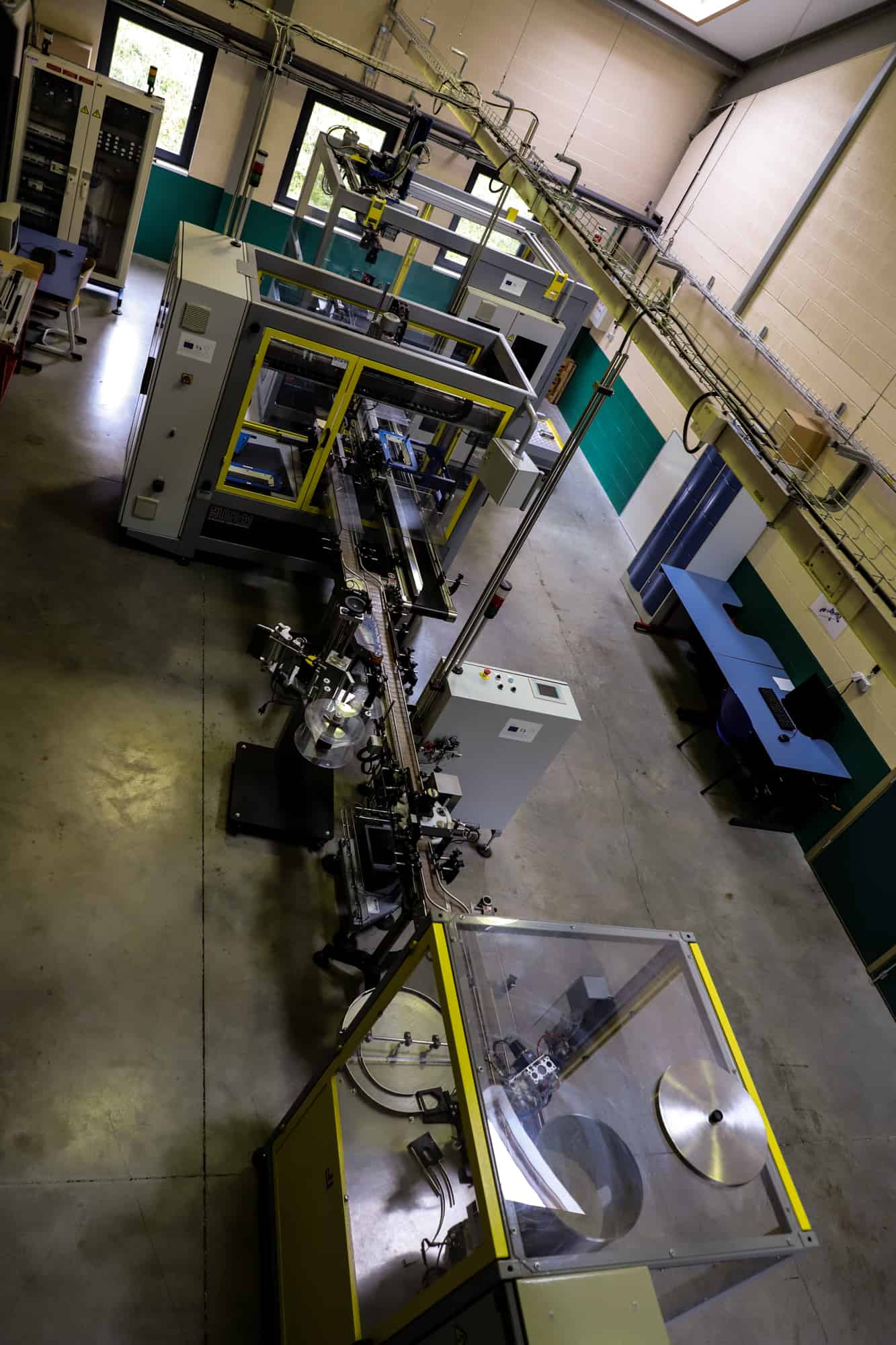 Le laboratoire avec la ligne de production didactique complète (granulé ou liquide) de taille industrielle entièrement automatisée avec table de distribution, dosage, bouchonnage, pesage, mise en boite et palettiseur.
